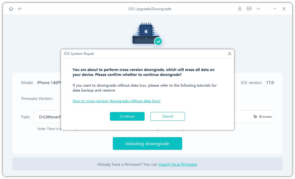- Schritt 4Nachdem die Firmware bereit ist, klicken Sie auf „Downgrade initiieren.“ Stellen Sie sicher, dass Sie ein Backup haben, da das Downgrade alle Daten und Einstellungen löscht. Klicken Sie auf „Weiter“, um fortzufahren.