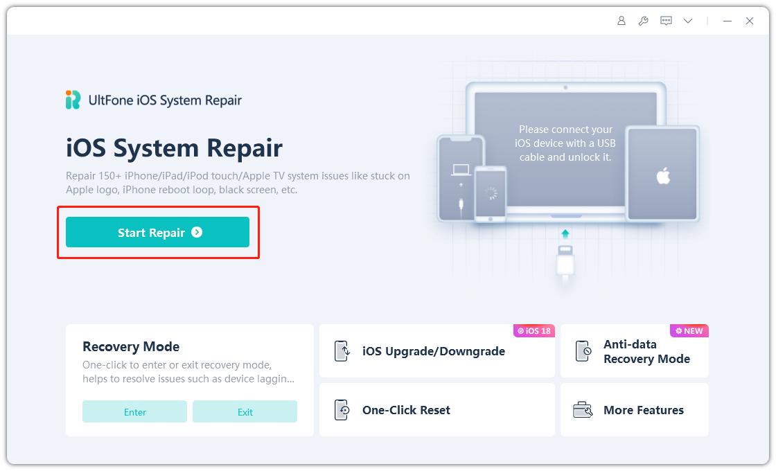 - Schritt 1Laden Sie UltFone iOS Systemreparatur auf Ihren PC oder Mac herunter und öffnen Sie es. Verbinden Sie Ihr iPhone, iPad oder iPod touch mit dem originalen Apple Lightning-Kabel. Klicken Sie auf „Start“, um das iOS-Systemreparaturmodul zu betreten.